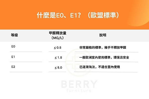 E0、E1是歐盟針對板材中甲醛釋放量所訂定的標準,常見於進口板材(如德國、奧地利等歐洲品牌)。